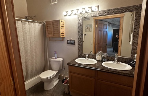 We call this the Saddle house, Just Renovated with a fully loaded kitchen, Granite countertops, Stainless appliances, LG Washer and Dryer . Vaulted Ceilings, Two bedrooms with queen beds and walk in closets, Wall mounted flat screens in every room. You'll love the open living room with a xxl bean bag, Reclining couch, perfect for relaxing, a loft above for the kids with a twin mattress and Air Mattress for extra guests.
