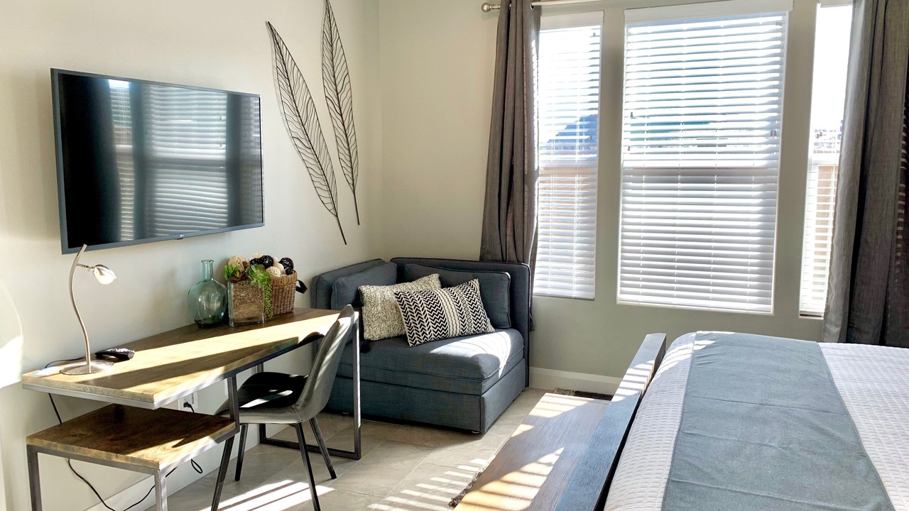 Bedroom 1: King size bed, desk, flat-screen tv, Large walk-in closet Ensuite bathroom with walk-in rain shower. Also featuring a European glass door. (Main Level, Sleeps 2)